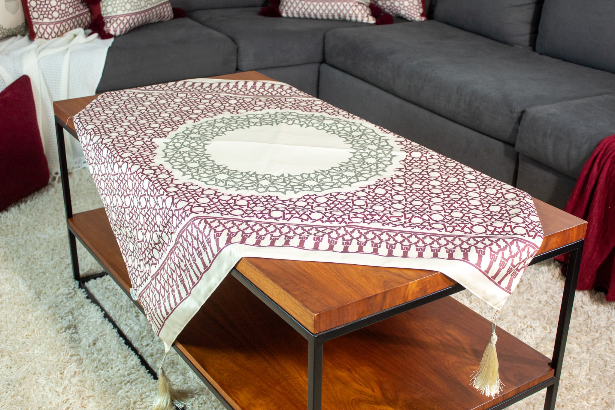 Square table cover with minaret motifs, available in various sizes for Ramadan decor.