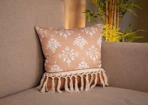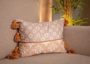 Elegant decorative cushions with ethnic-inspired patterns in warm gold and purple hues.
