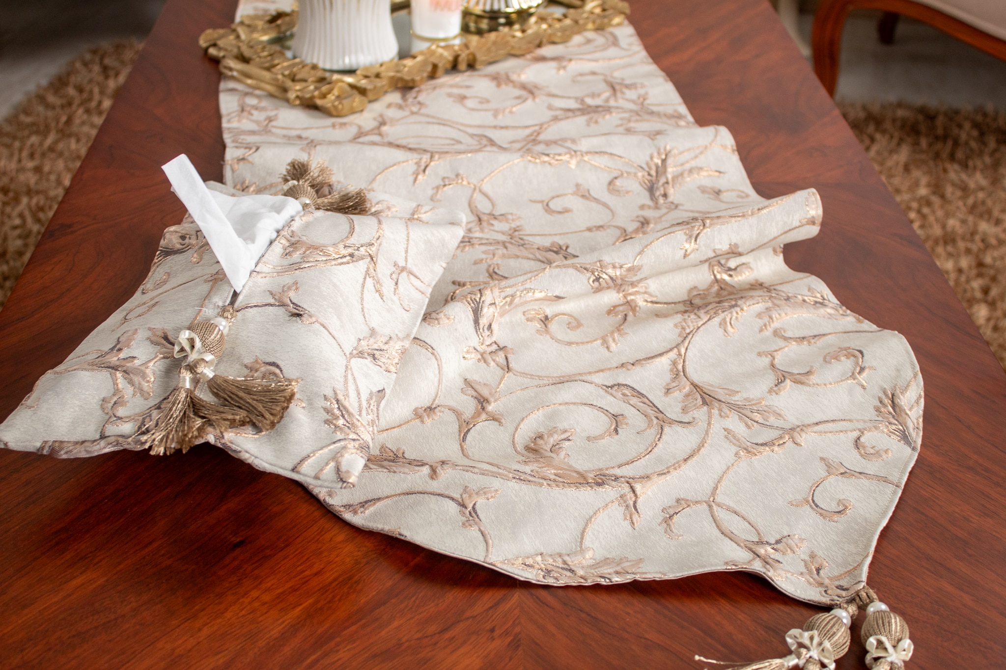 Elegant tissue box cover with intricate ethnic patterns, perfect for a luxurious setting.