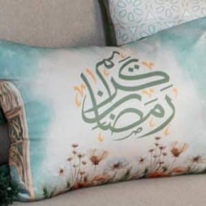 Elegant Ramadan decorative cushions with Arabic calligraphy and tassels, available in square and rectangular sizes.
