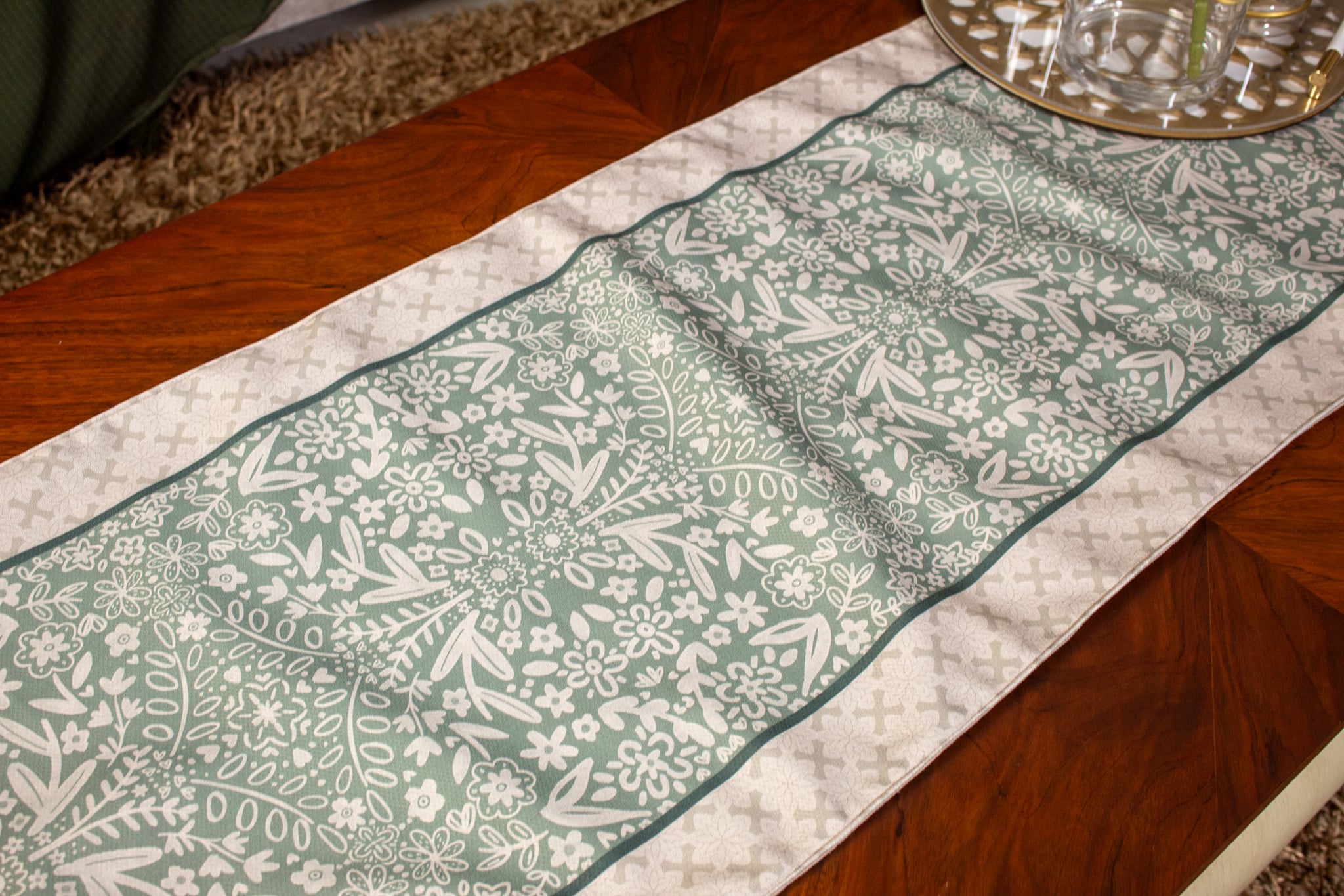 Double-sided table runner with soft botanical motifs, available in multiple sizes.