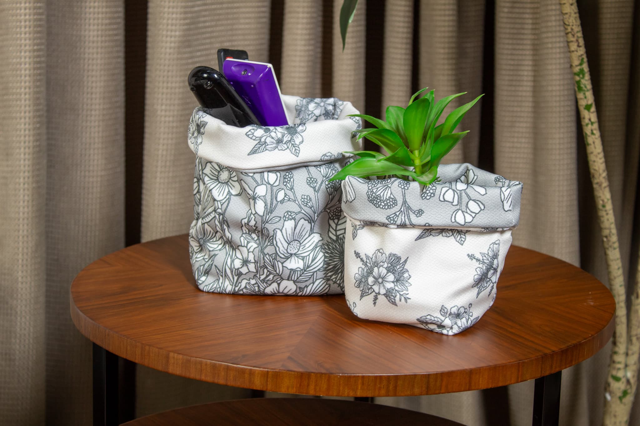 Fabric storage boxes with floral motifs, perfect for stylish spring home organization.