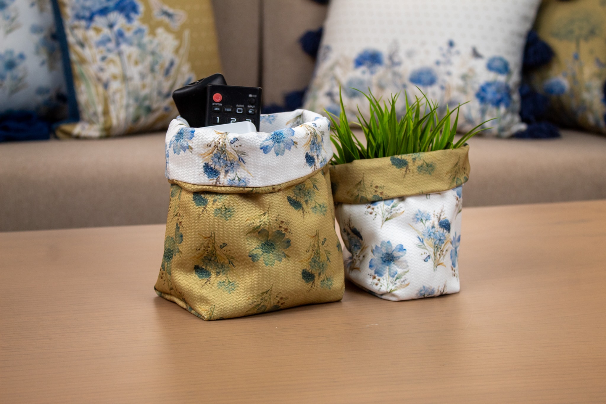 Fabric storage boxes with floral motifs, perfect for stylish spring home organization.