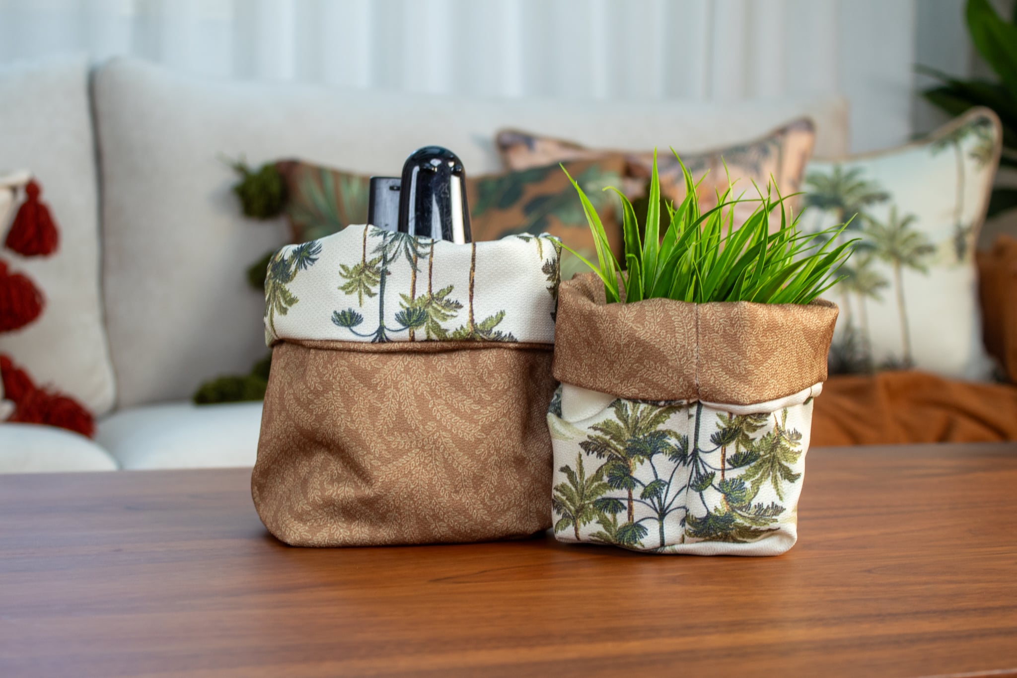 Fabric storage boxes with floral motifs, perfect for stylish spring home organization.