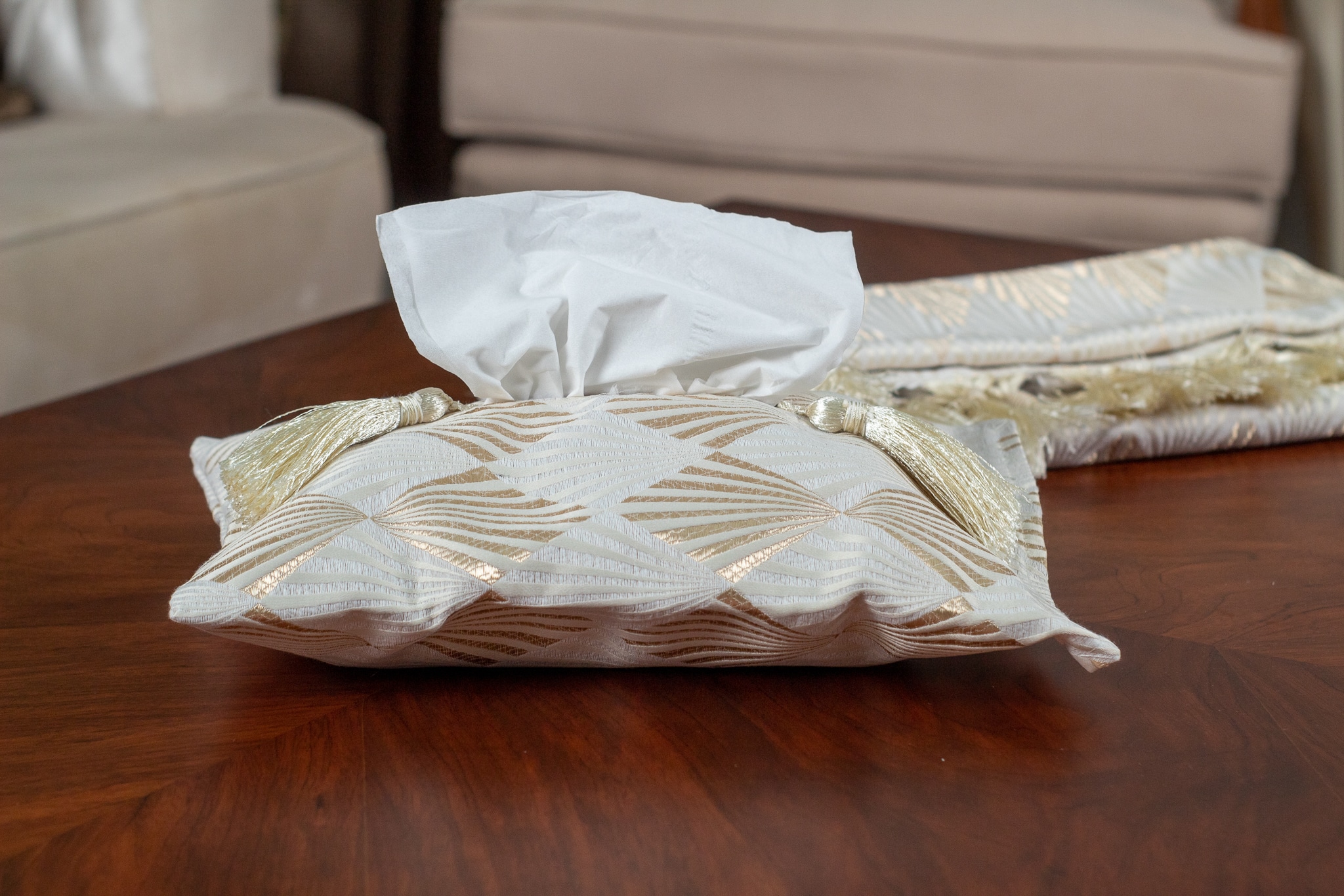 Elegant tissue box cover with intricate ethnic patterns, perfect for a luxurious setting.