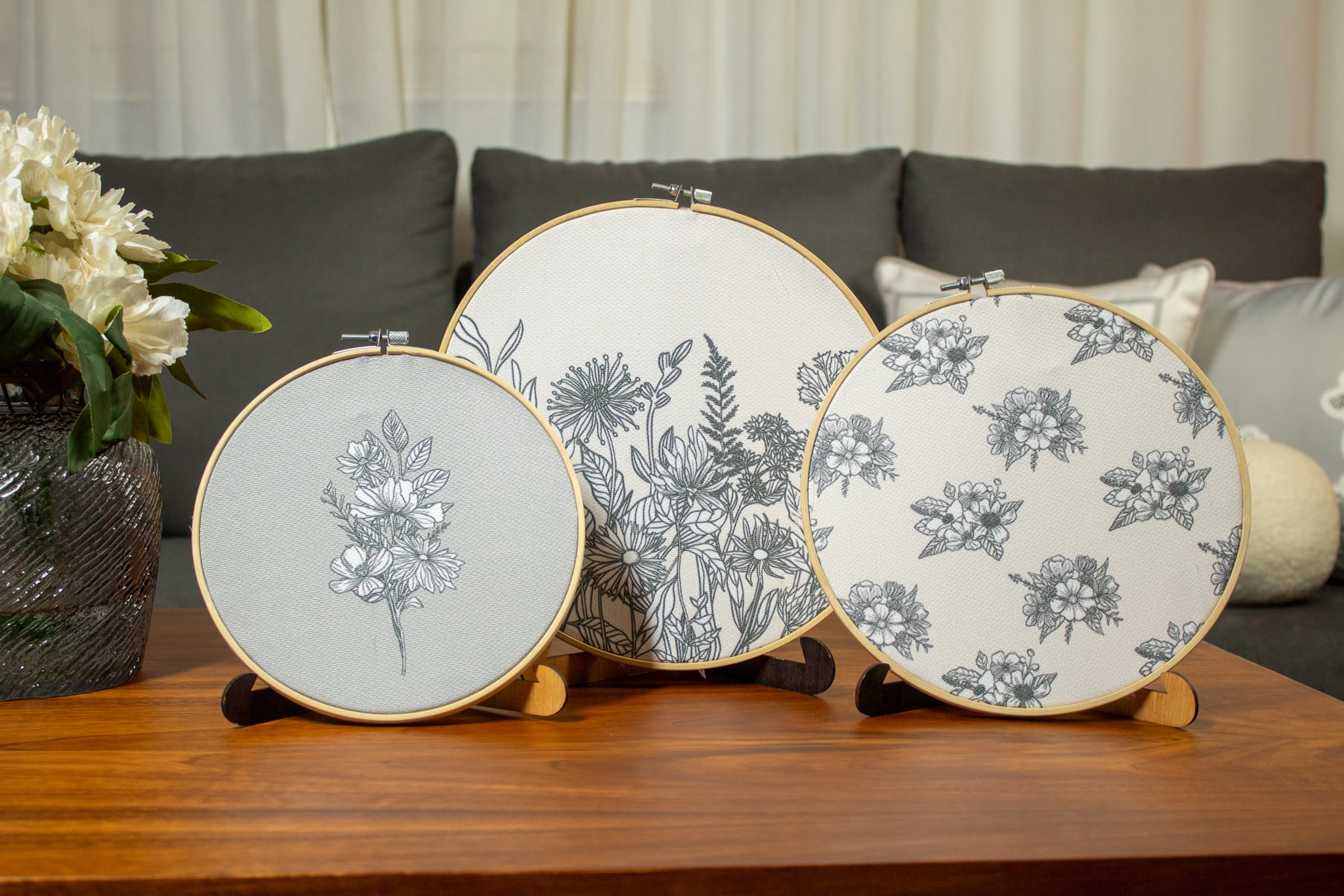 Wooden embroidery hoop set with botanical patterns, ideal for natural home decor.