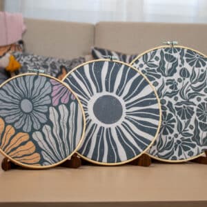 Wooden embroidery hoop set with botanical patterns, ideal for natural home decor.